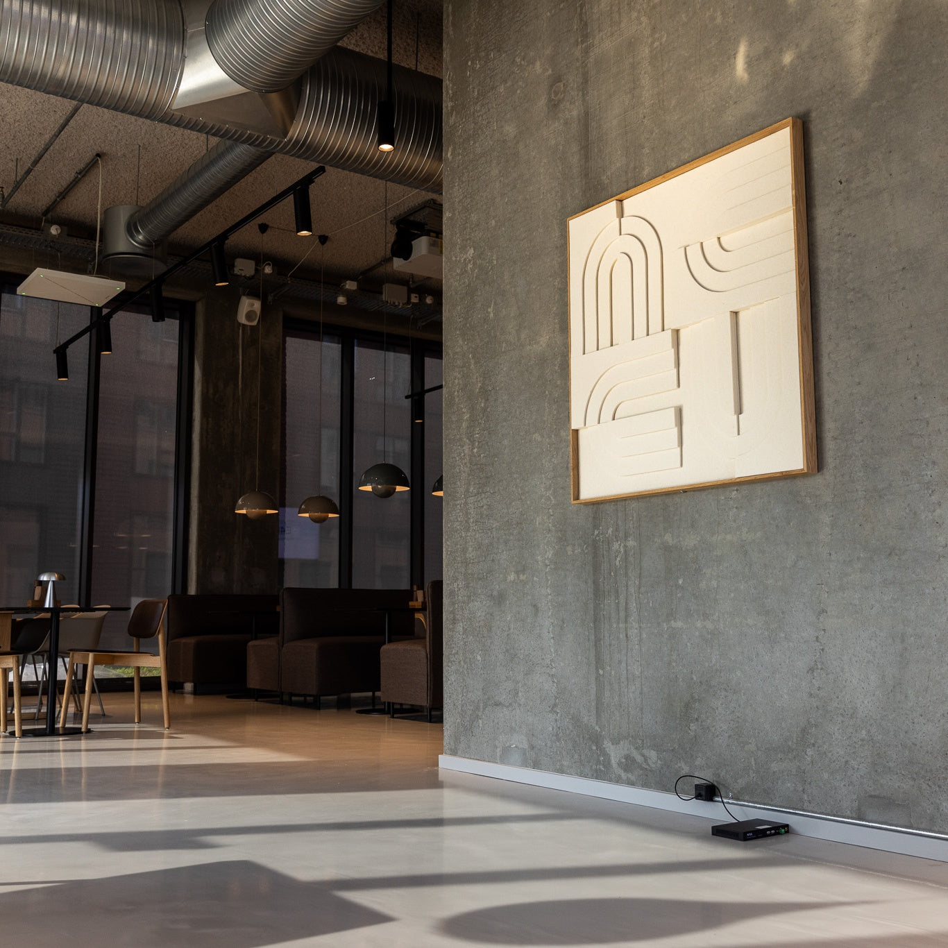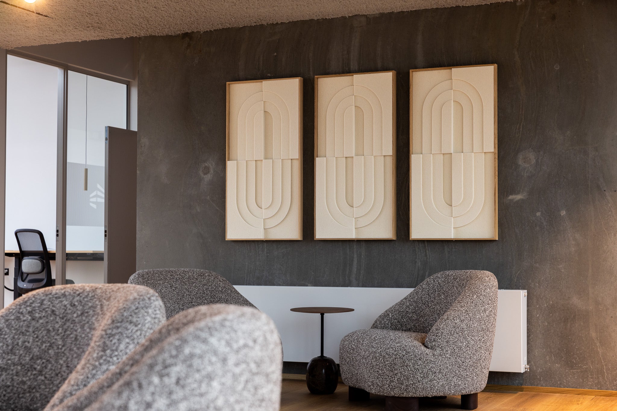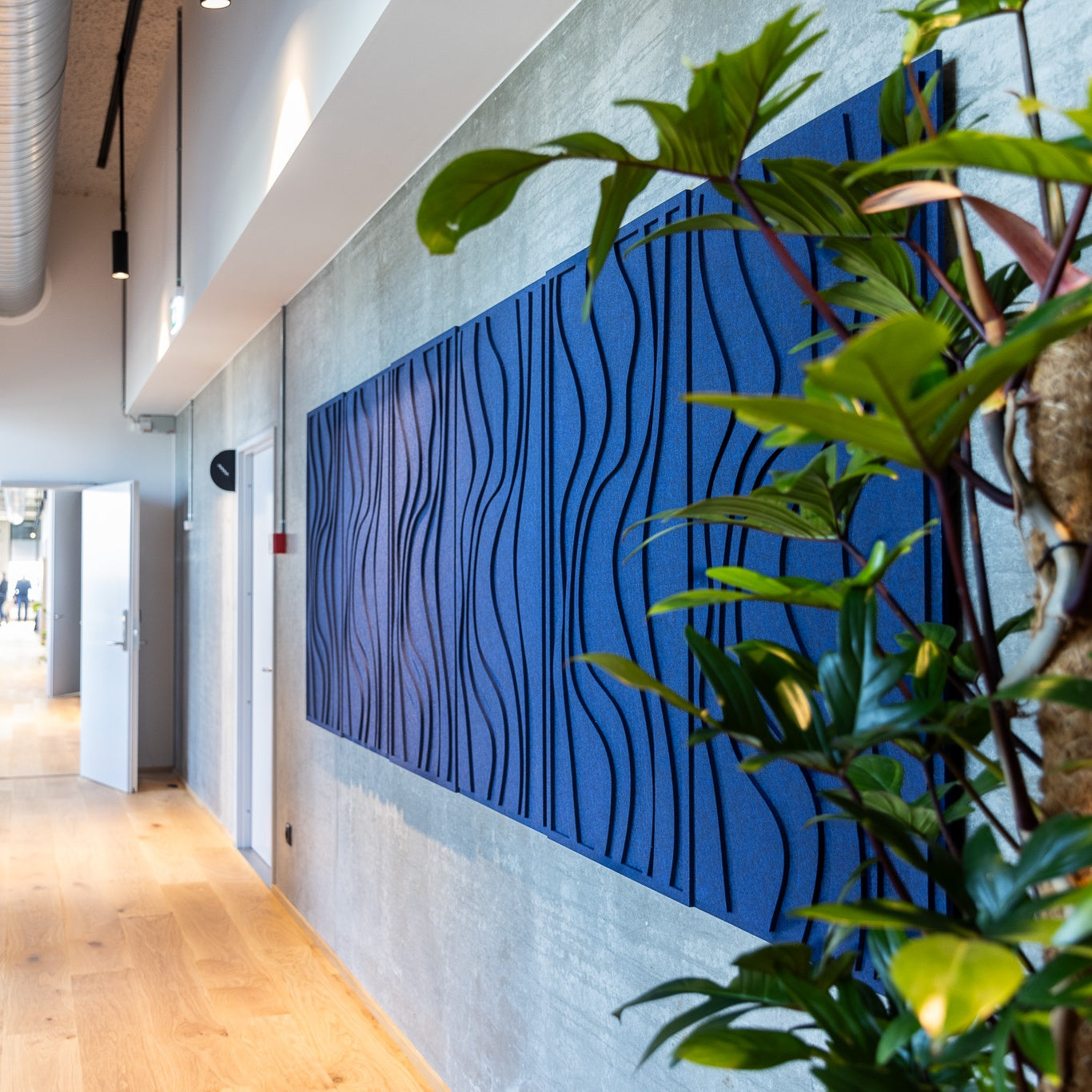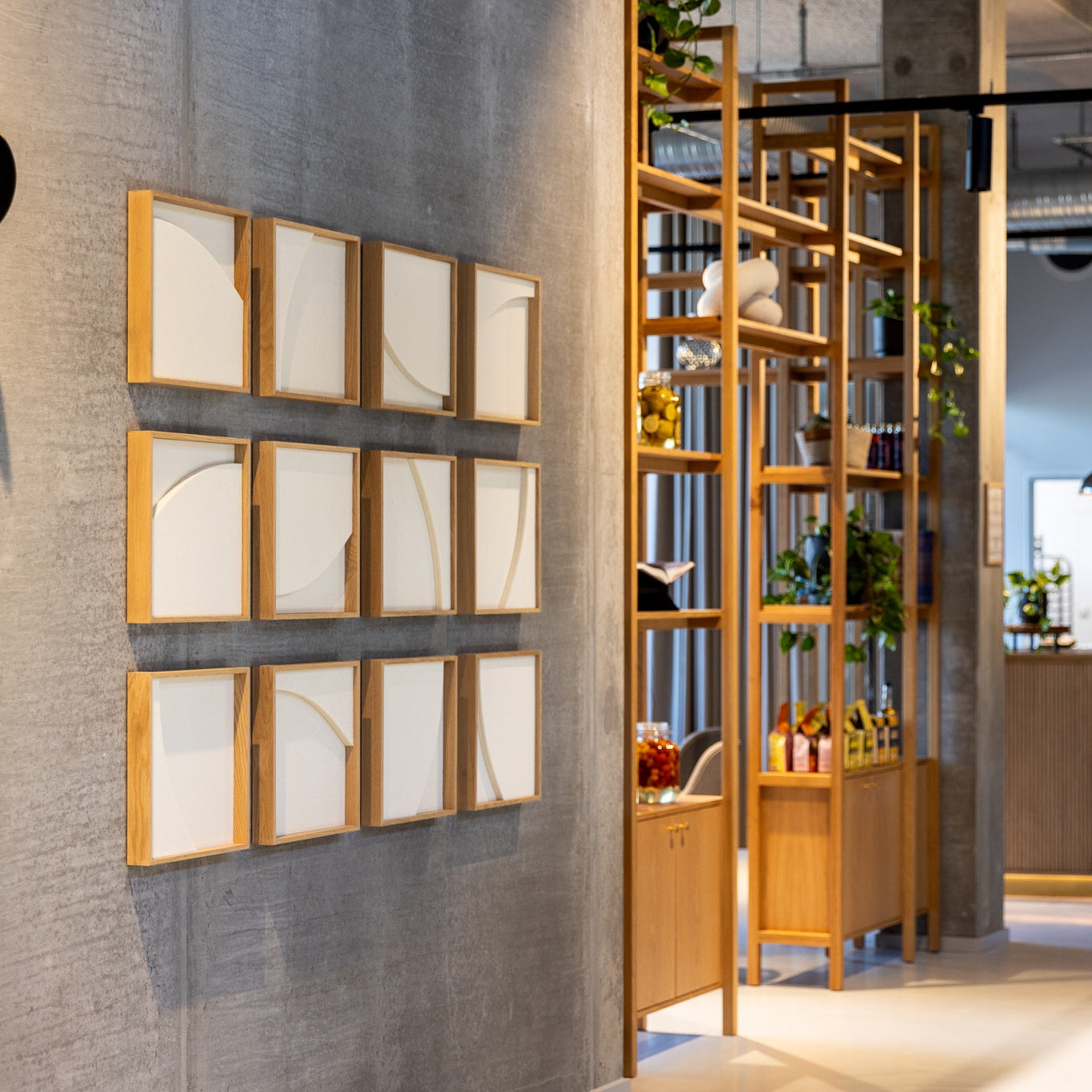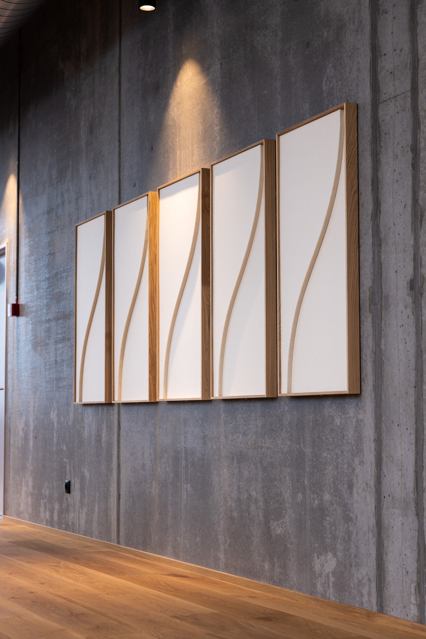 For DEAS, Arturel has supplied acoustic artworks for all floors of The Market – the new headquarters. Designed in collaboration with Kvadrat, the panels feature elegant oak frames and are arranged in installations of five to six pieces at a time. This not only enhances the acoustic experience but also creates an artistic expression that brings warmth and vibrancy to the modern office spaces.